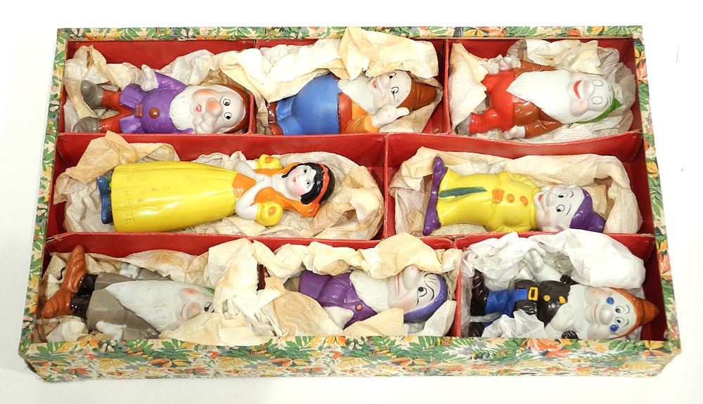 LOT 226 C.1938 Walt Disney Enterprises "Snow White & 7 Dwarfs" (George Borgfeldt) with Original Box. Estimate: $150 - $250 Sold For: $300 Auction Date: Tuesday, January 14 2025 at 4:00 PM