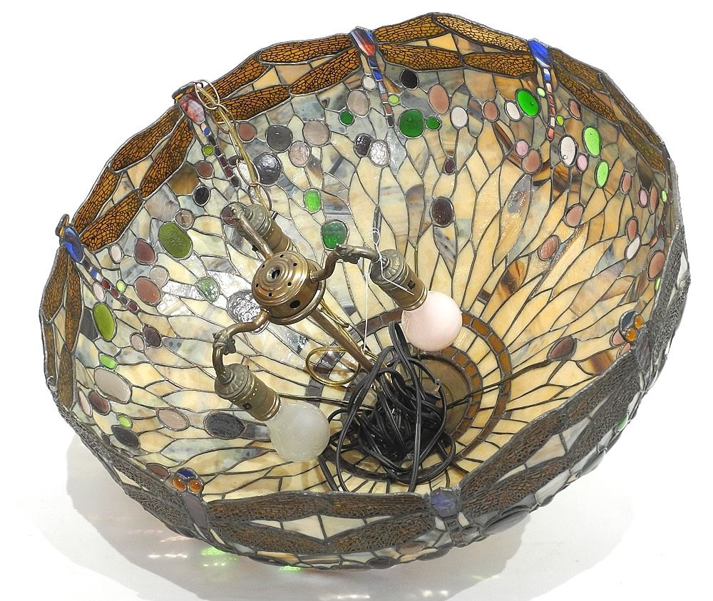 Leaded Glass "Dragonfly" Ceiling Fixture, Approx. 15" x 24" Diameter. (4 pieces missing).