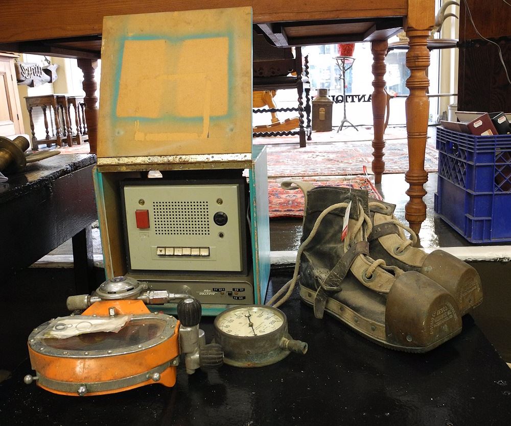 LOT 73 C.1940's Desco Dive Boots / Underwater Drill / Suits / Pressure Guage / Comm. Box. Estimate: $1,000 - $1,500 Sold For: $650 Auction Date: Tuesday, January 14 2025 at 4:00 PM