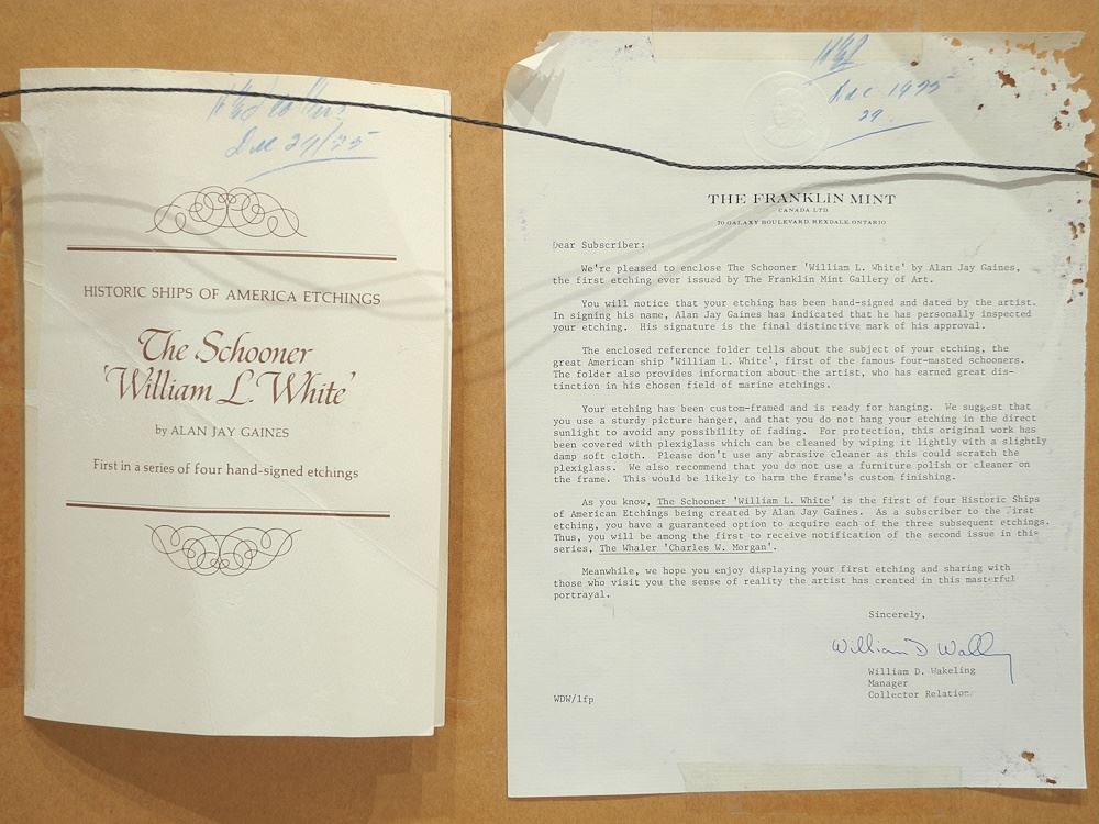 LOT 261 Franklin Mint Etching signed Alan Jay Gaines, 13" x 18 1/2", "The Schooner William A...". Estimate: $60 - $100 Auction Date: Tuesday, January 14 2025 at 4:00 PM
