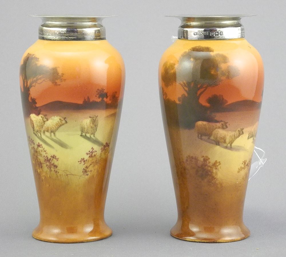Pair of Royal Doulton "Pasture" Vases with Hallmarked Silver Rims, 4 1/4".