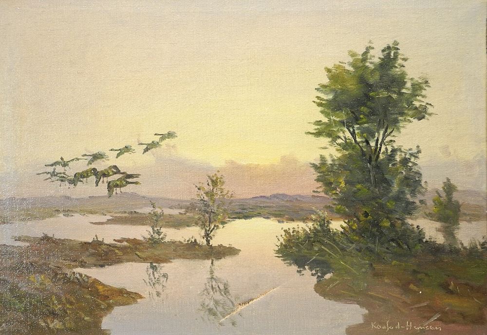 LOT 251 Oil on Canvas Possibly signed Koejad Hansen, 18 x 25 1/2", "Ducks Taking Flight" (tear noted). Estimate: $60 - $100 Sold For: $15 Auction Date: Tuesday, March 11 2025 at 4:00 PM