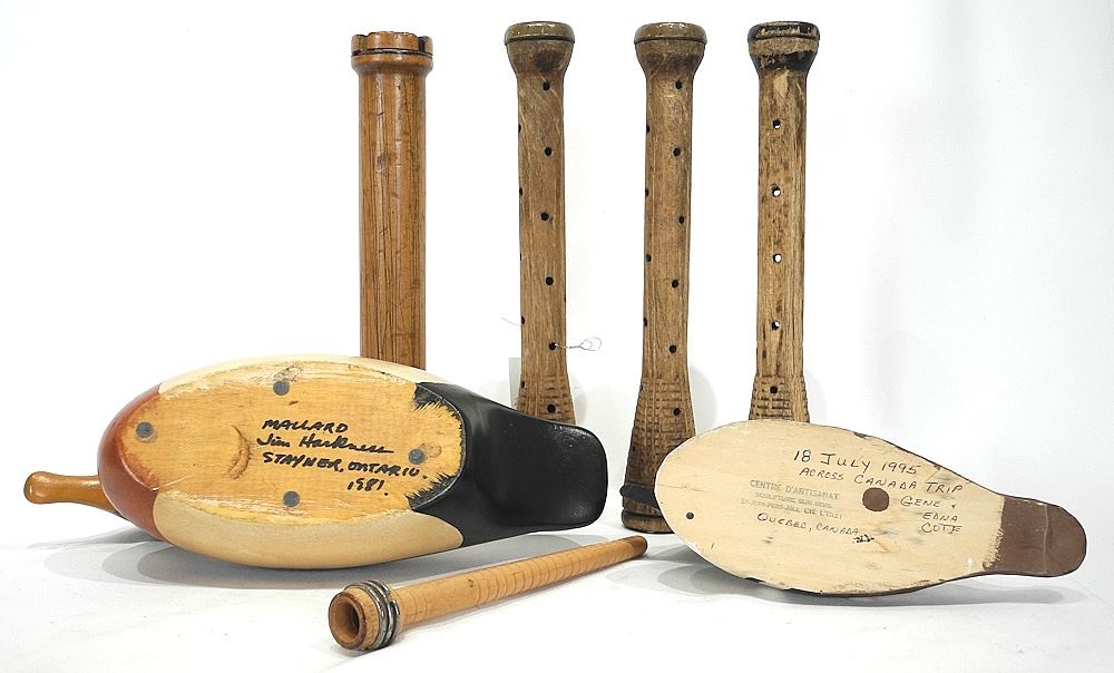 LOT 183 Two Carved Wood Decoys & Collection of Wooden Mill Bobbins, 9 1/2-13"L. Estimate: $50 - $60 Sold For: $60 Auction Date: Tuesday, March 11 2025 at 4:00 PM