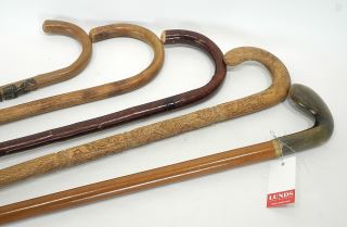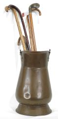 LOT 25 Handled Copper Vessel (16 1/2"h) with Collection of Walking Sticks. Estimate: $50 - $60 Sold For: $80 Auction Date: Tuesday, January 13 2026 at 4:00 PM