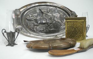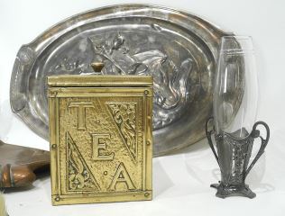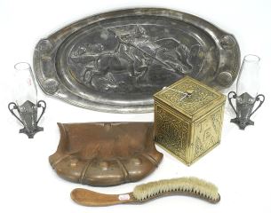 LOT 108 Collection of Metal Wares: Embossed Humidor (5 1/2"h)/Pair of Vases/ Copper Crumb/Damaged Tray. Estimate: $60 - $100 Sold For: $20 Auction Date: Tuesday, January 13 2026 at 4:00 PM