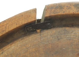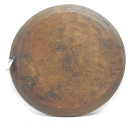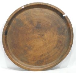 LOT 313 Primitive Round Wood Tray with Metal Stabilizers, 26 1/2"w. Estimate: $50 - $100 Auction Date: Tuesday, January 13 2026 at 4:00 PM