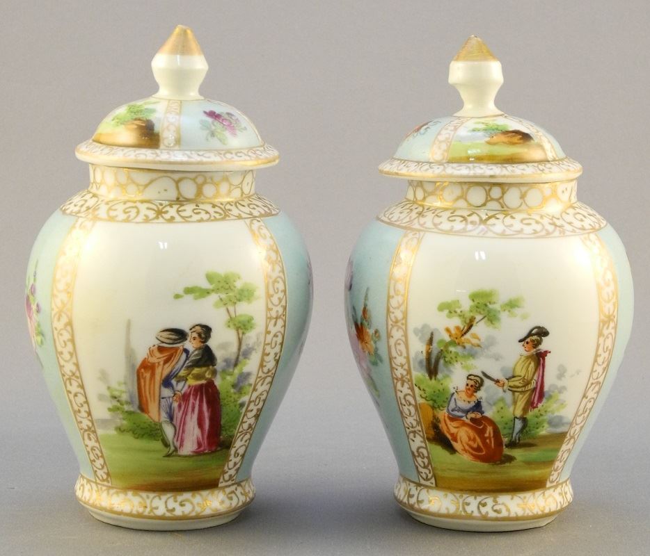 Pair of Dresden covered urns C.1892 Grossbaum & Sons, 5 1/4".
