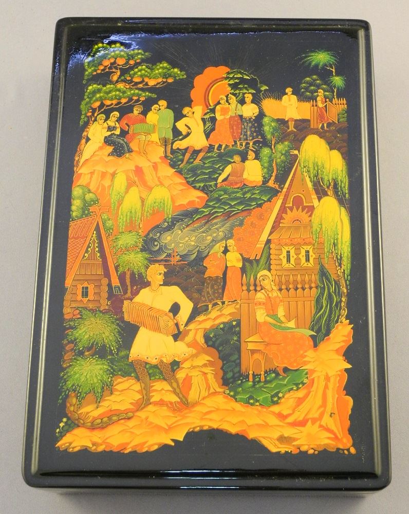 Russian lacquer box & contents, 9 1/4" x 6 1/2" x 2 1/4".