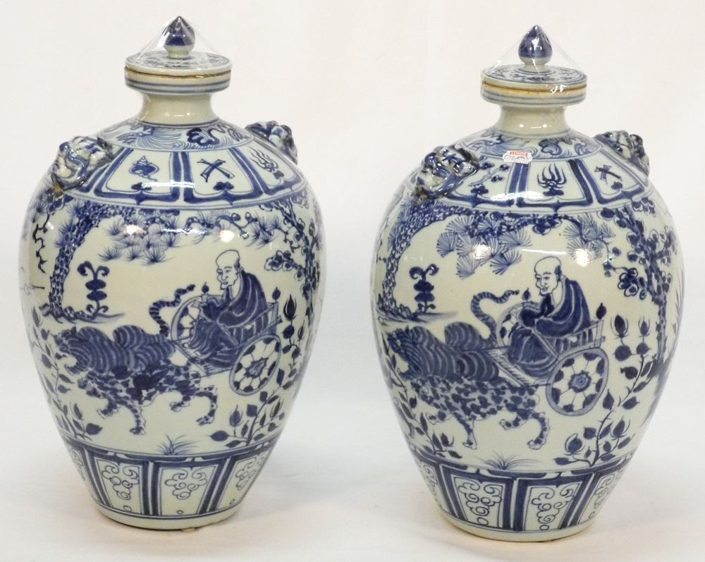 LOT 116 Pair of 20th Century Blue & White Tapered Oviform Vases, 15" high. Estimate: $100 - $150 Sold For: $70 Auction Date: Tuesday, March 23 2021 at 6:00 PM