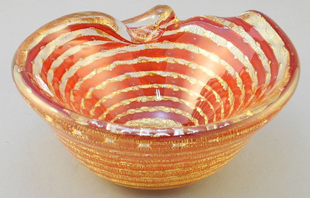 Barovier & Toso Ruby & Gold Aventurine Glass Bowl, 7 3/4" wide.