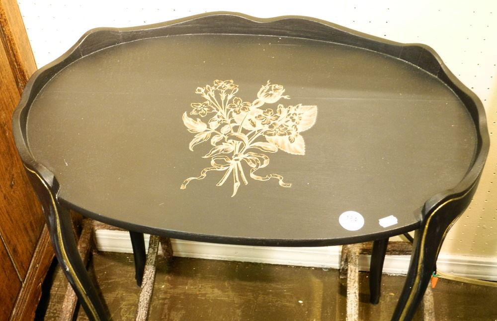 LOT 184 Black Painted Occasional Table with Stenciled Decoration, 26" high. Estimate: $50 - $70 Auction Date: Tuesday, July 20 2021 at 6:00 PM