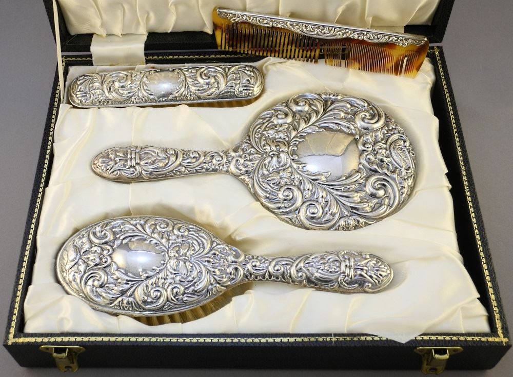 LOT 149 Cased Embossed Silver 3 Piece Brush Set, case 12 1/8" wide. Estimate: $125 - $175 Sold For: $80 Auction Date: Tuesday, July 20 2021 at 6:00 PM