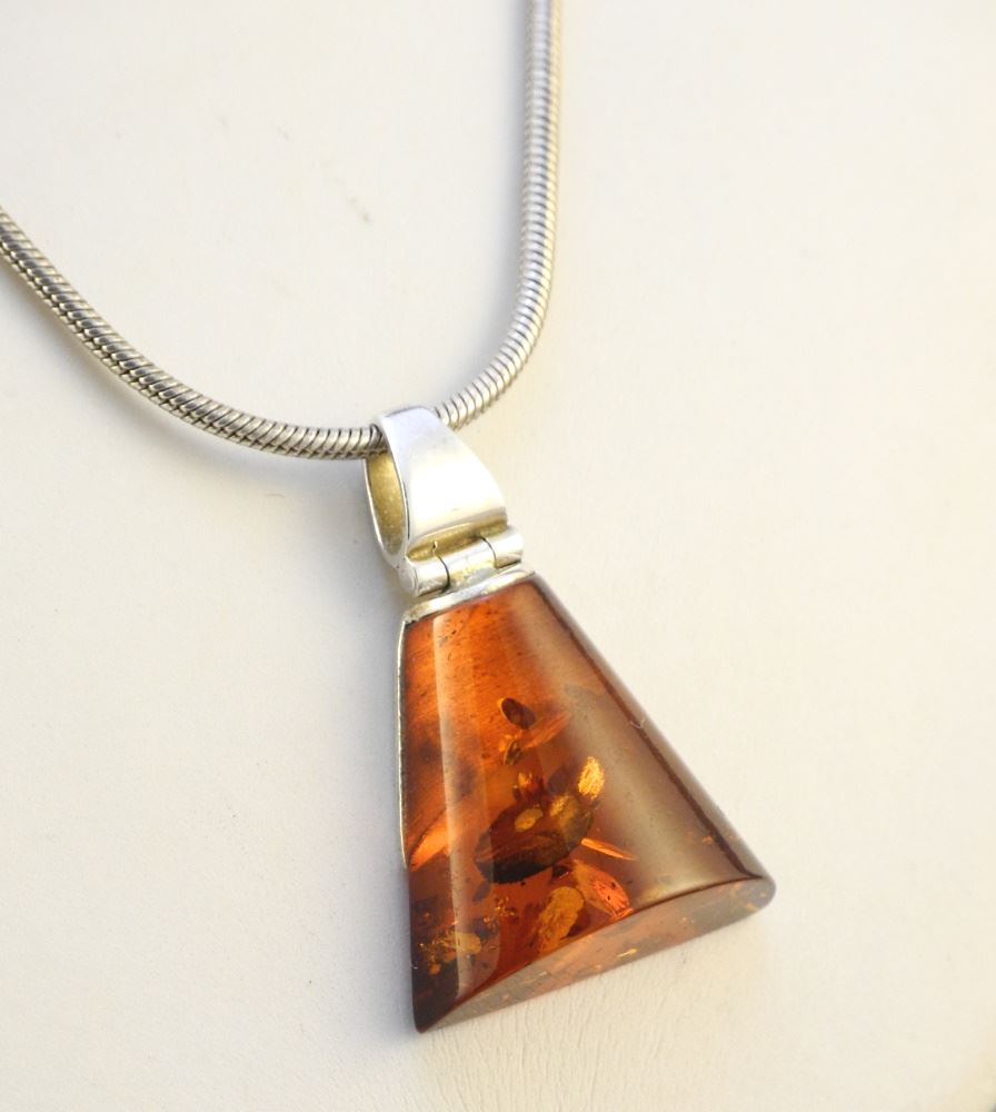 LOT 72 Triangular Amber & Silver Pendant on Chain. Estimate: $100 - $150 Auction Date: Tuesday, July 20 2021 at 6:00 PM