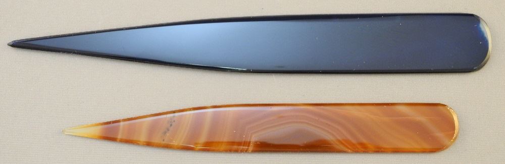 2 Agate Letter Openers: Caramel & Blue, 6" & 7 1/2" length.