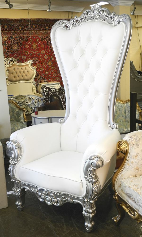 Pair of Ornate Silver Finish & White Button Tufted Occasional Chairs, 72" high.