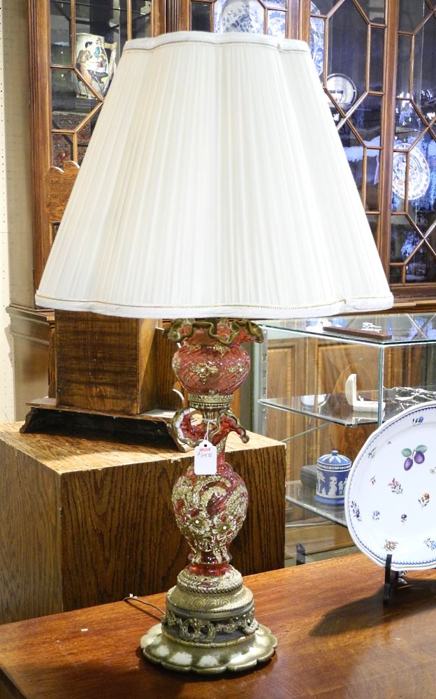 LOT 82 Pair of Floral Encrusted Cranberry Glass Table Lamps. Estimate: $100 - $200 Auction Date: Tuesday, November 02 2021 at 6:00 PM