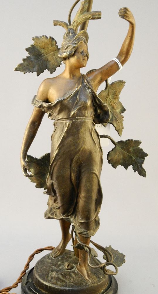 Art Nouveau Figural Lamp with Floral Glass Shade, 23" high.