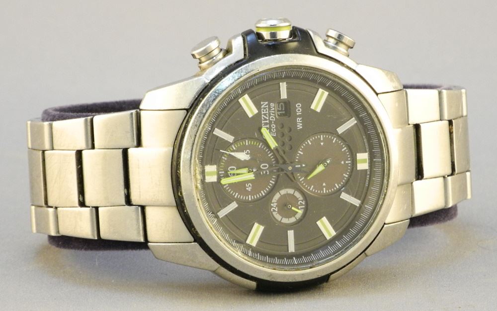 LOT 222 Citizen Eco Drive WR 100 Wristwatch with Case, crystal scratched. Estimate: $80 - $120 Sold For: $100 Auction Date: Tuesday, January 25 2022 at 6:00 PM