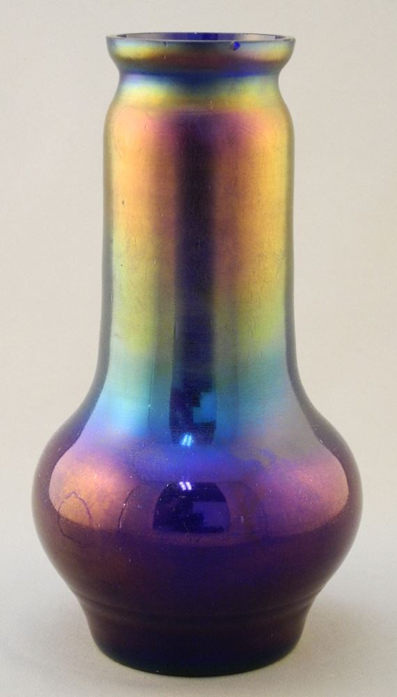 LOT 33 Loetz-Style Iridescent Glass Vase with Rose Enameling, 8 5/8" High, Rim Nibbled. Estimate: $100 - $150 Sold For: $50 Auction Date: Tuesday, July 26 2022 at 6:00 PM