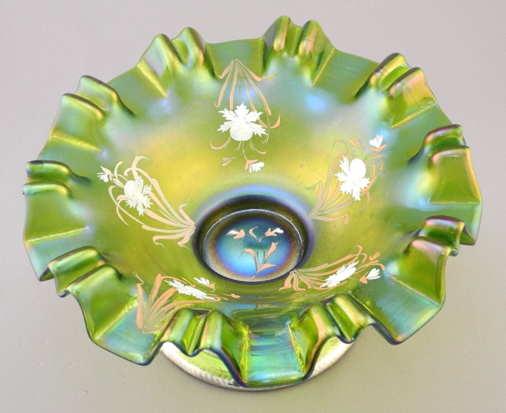 LOT 262 Loetz-Style Ruffled Rim Bowl with Enameling & Plated Base, 5" x 10 1/4"D. Estimate: $120 - $180 Auction Date: Tuesday, July 26 2022 at 6:00 PM