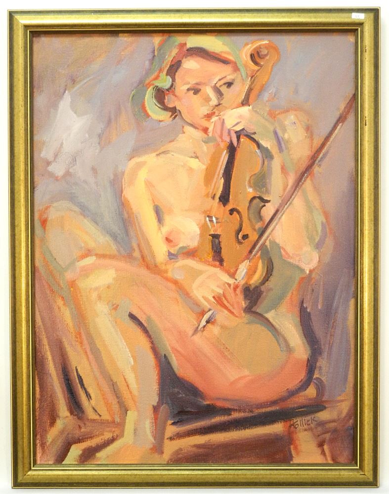 LOT 46 Oil on Canvas Signed (Elizabeth) Hollick, 24" x 18", "Nude with Violin". Estimate: $60 - $100 Sold For: $30 Auction Date: Tuesday, July 26 2022 at 6:00 PM