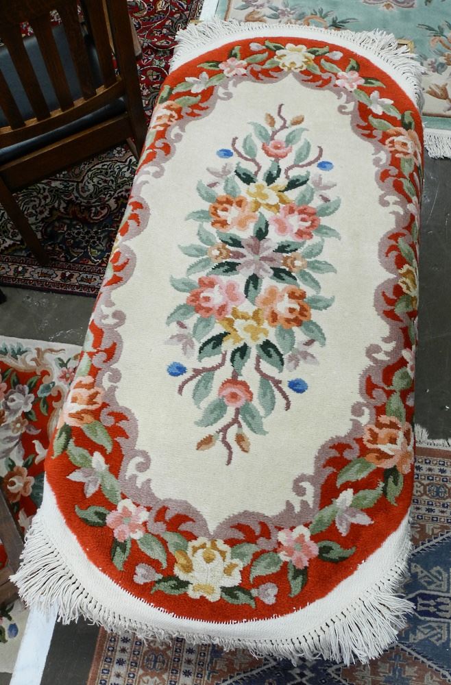 2 Chinese Sculpted Wool Carpets with Scarlet Features, 71 1/2" x 31 1/2", Recently Cleaned.