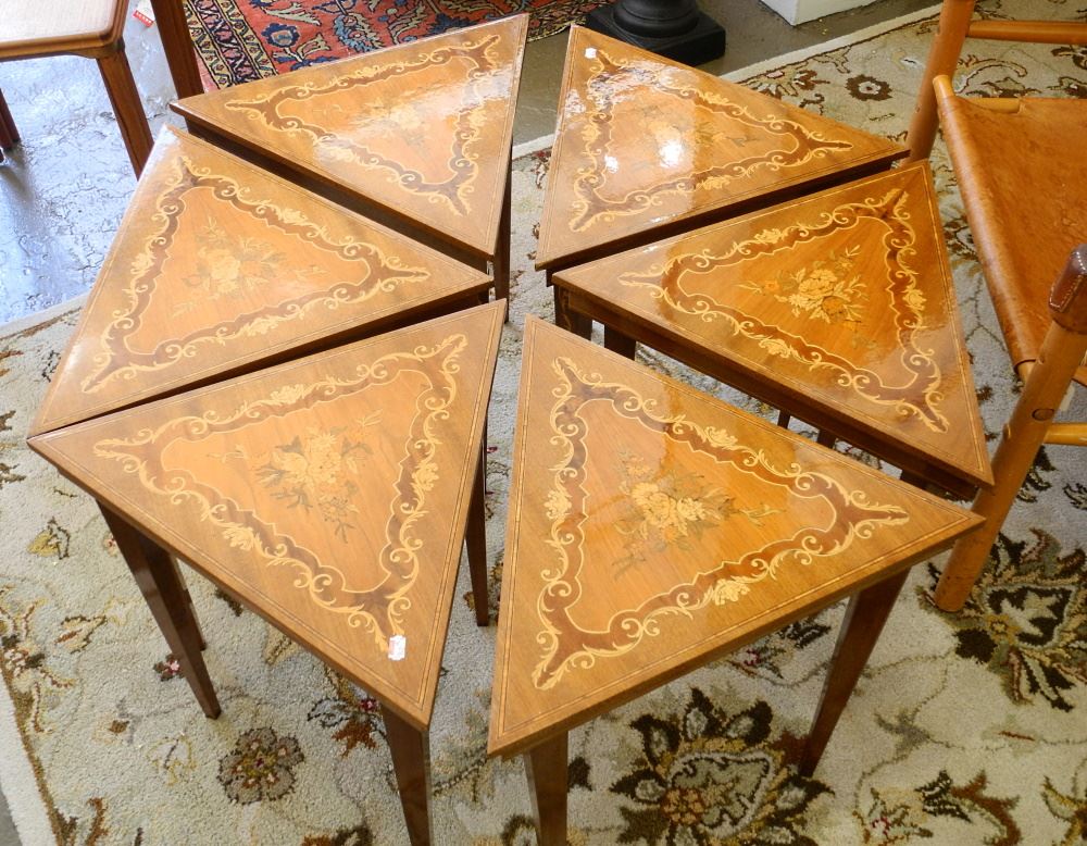 Set of 6 Sorrento Marquetry Side Tables Forming a Hexagon, Each 19 1/ x 18 3/8 x 18 3/8".