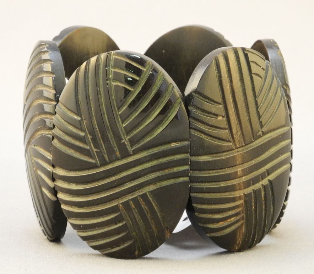 LOT 78 Art Deco Carved Horn Bracelet, 7" x 2". Estimate: $50 - $100 Sold For: $20 Auction Date: Tuesday, July 26 2022 at 6:00 PM