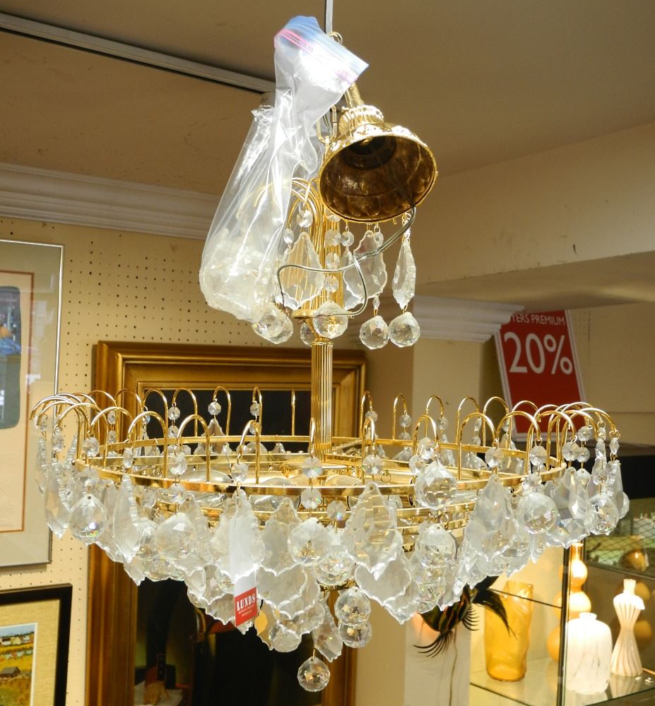 LOT 237 Tiered Crystal Chandelier, 20" Diameter. Estimate: $50 - $100 Sold For: $20 Auction Date: Tuesday, July 26 2022 at 6:00 PM