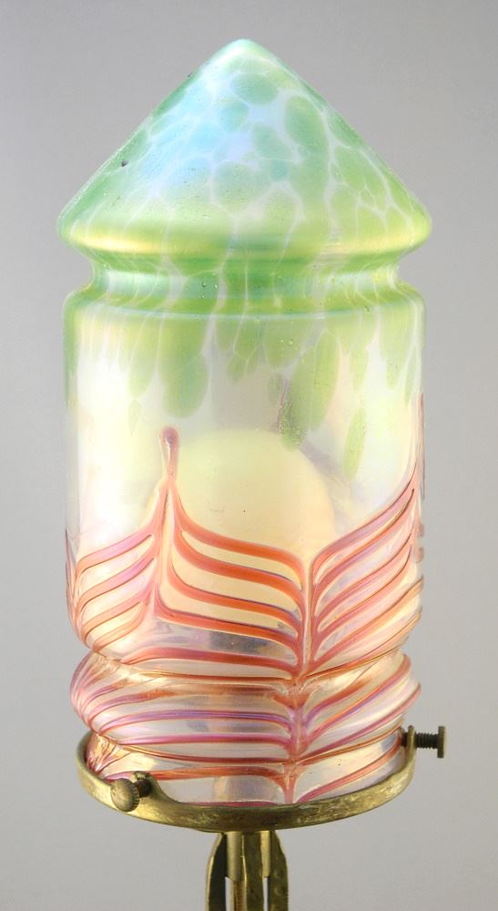 Quattro Columnar Bronze Arts & Crafts Desk Lamp, With Iridescent Feather Shade.