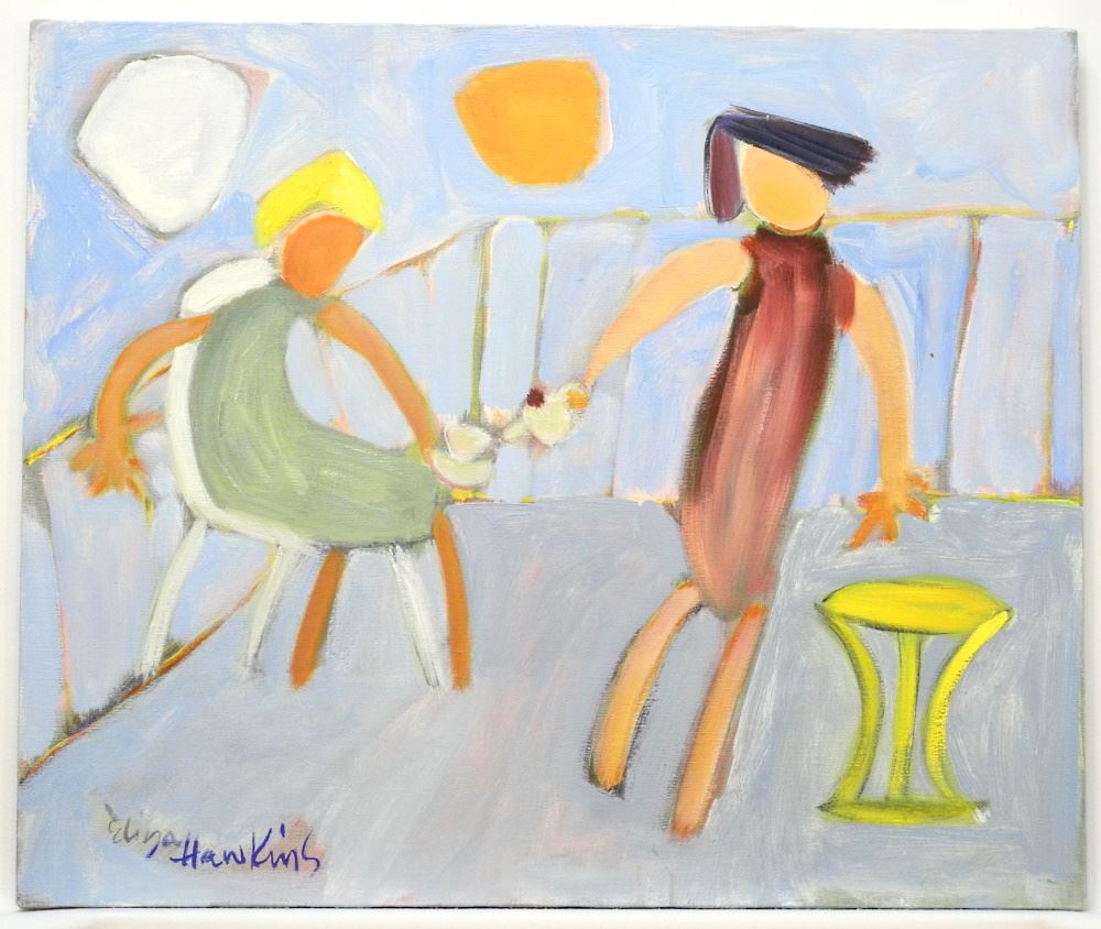 LOT 137 Oil on Canvas Signed Eliza Hawkins, 20" x 24", "On The Deck", Unframed. Estimate: $100 - $150 Sold For: $100 Auction Date: Tuesday, March 14 2023 at 4:00 PM