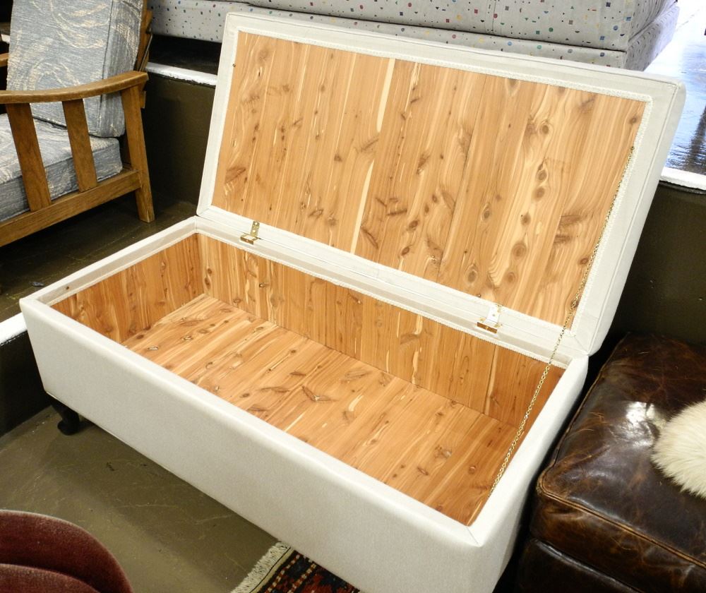 LOT 43 Linen Hinged Cedar Lined Chest on Cabriole Legs, 49" wide. Estimate: $100 - $200 Sold For: $120 Auction Date: Tuesday, March 14 2023 at 4:00 PM
