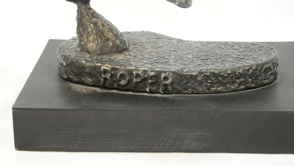 Cast Metal Horse Sculpture Signed "Roper", On Wood Plinth 12 7/8"X18" 1/2"X8".