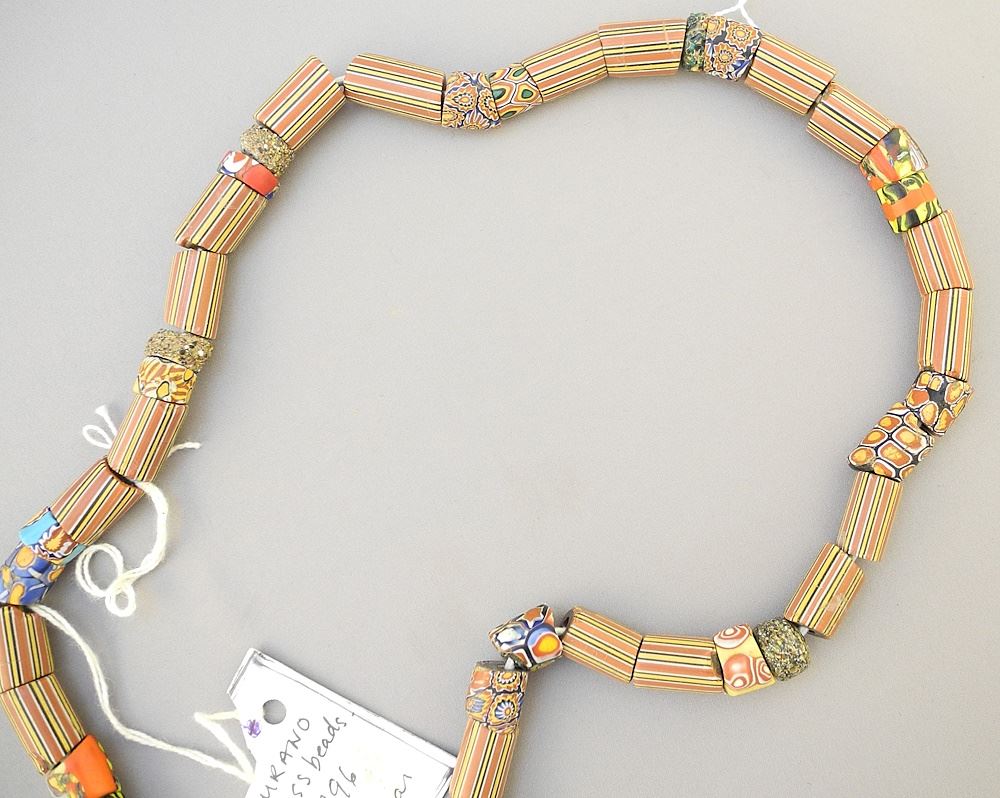 LOT 244 Strand of Antique Murano Glass Beads , acquired Zanzibar, approx. 26". Estimate: $60 - $100 Sold For: $90 Auction Date: Tuesday, July 18 2023 at 4:00 PM