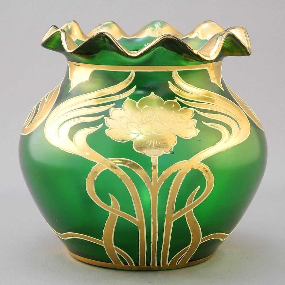 LOT 248 Art Nouveau Gilt Green Glass Vase, 4 3/8"H. Estimate: $60 - $100 Sold For: $60 Auction Date: Tuesday, July 18 2023 at 4:00 PM
