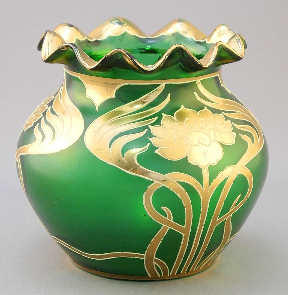 Art Nouveau Gilt Green Glass Vase, 4 3/8"H.