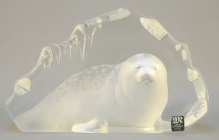 Glass Seal Sculpture with "Mats Jonasson Sweden" Sticker, 7" Wide.