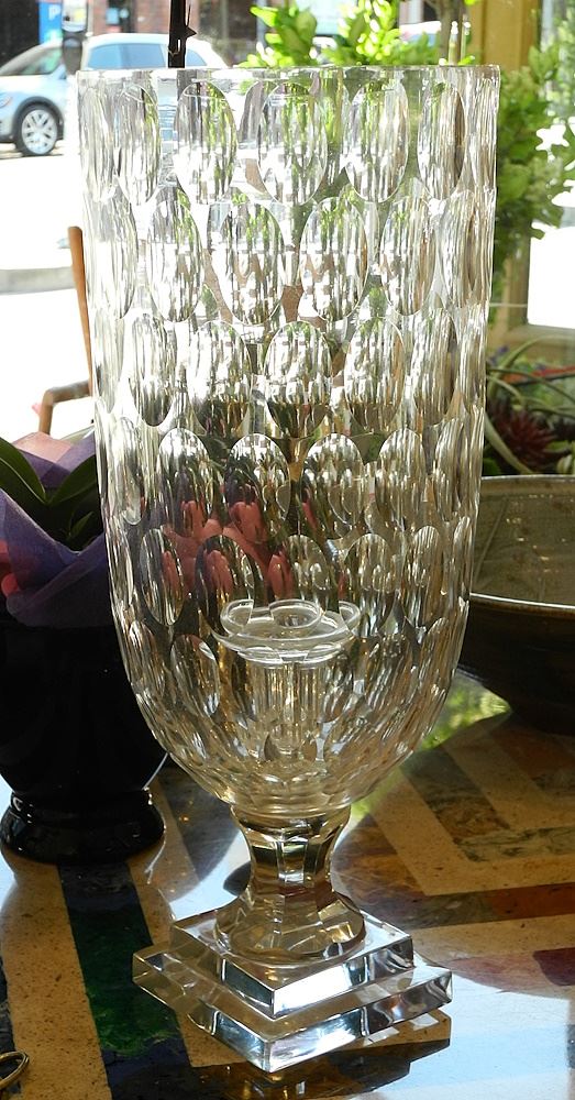 LOT 40 Pair of Contemporary Oval Facet Crystal Urns, 16 1/2"H, small Shell Foot Rim. Estimate: $80 - $100 Sold For: $70 Auction Date: Tuesday, July 18 2023 at 4:00 PM