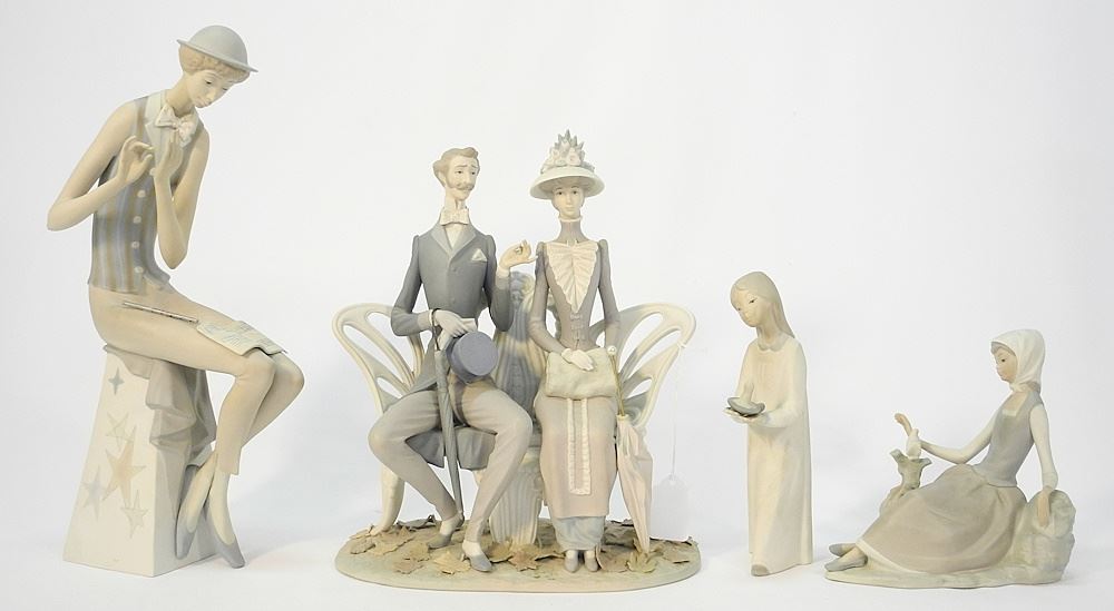 4 Lladro Figures: Seated Couple, 11 1/2" x 9 3/4" x 5 1/4" / Flautist , Two Girls.