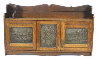 LOT 260A Oak Wall Cabinet with Shakespearean Motif Panels, as found, Losses Noted 15 1/3" X 26 3/8" X 5 1/2" Estimate: $150 - $250 Auction Date: Tuesday, July 18 2023 at 4:00 PM