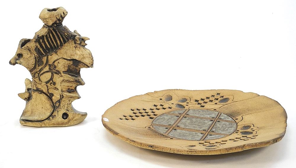 LOT 67 2 Stoneware Items signed and attrib. to (Bob)Kingsmill: Candle- stick, 11"H & signed plaqu Estimate: $80 - $120 Auction Date: Tuesday, July 18 2023 at 4:00 PM