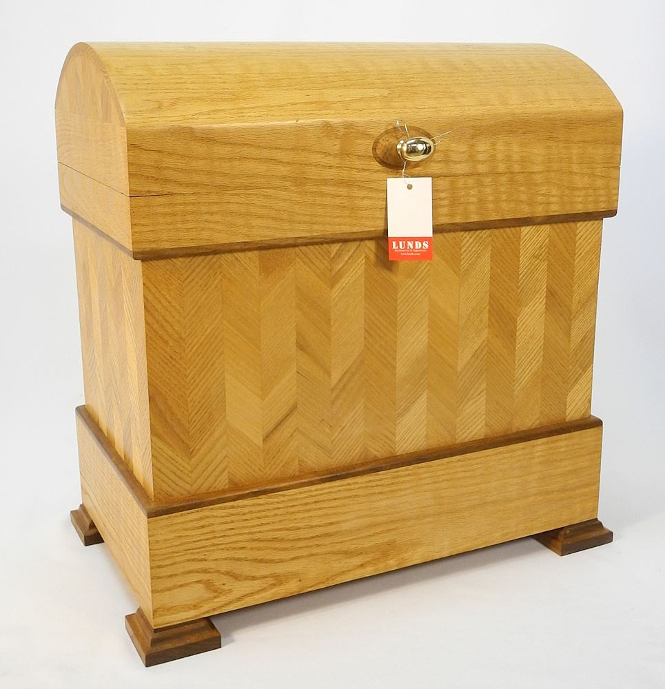 LOT 155 Artisanal Oak and Ash Domed Box, 20 x 19 3/4 x 12", includes contents. Estimate: $200 - $300 Sold For: $150 Auction Date: Tuesday, July 18 2023 at 4:00 PM