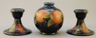 LOT 263 Pair of Moorcroft Pomegranate Candlesticks, 3 1/4"H and Globular Vase, 4 1/8"H. Estimate: $200 - $300 Auction Date: Tuesday, July 18 2023 at 4:00 PM