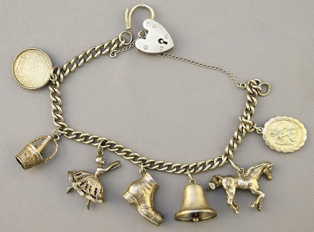 LOT 89 Hallmarked Silver Charm Bracelet with various Charms, 9.2 grams. Estimate: $50 - $60 Sold For: $35 Auction Date: Tuesday, July 18 2023 at 4:00 PM