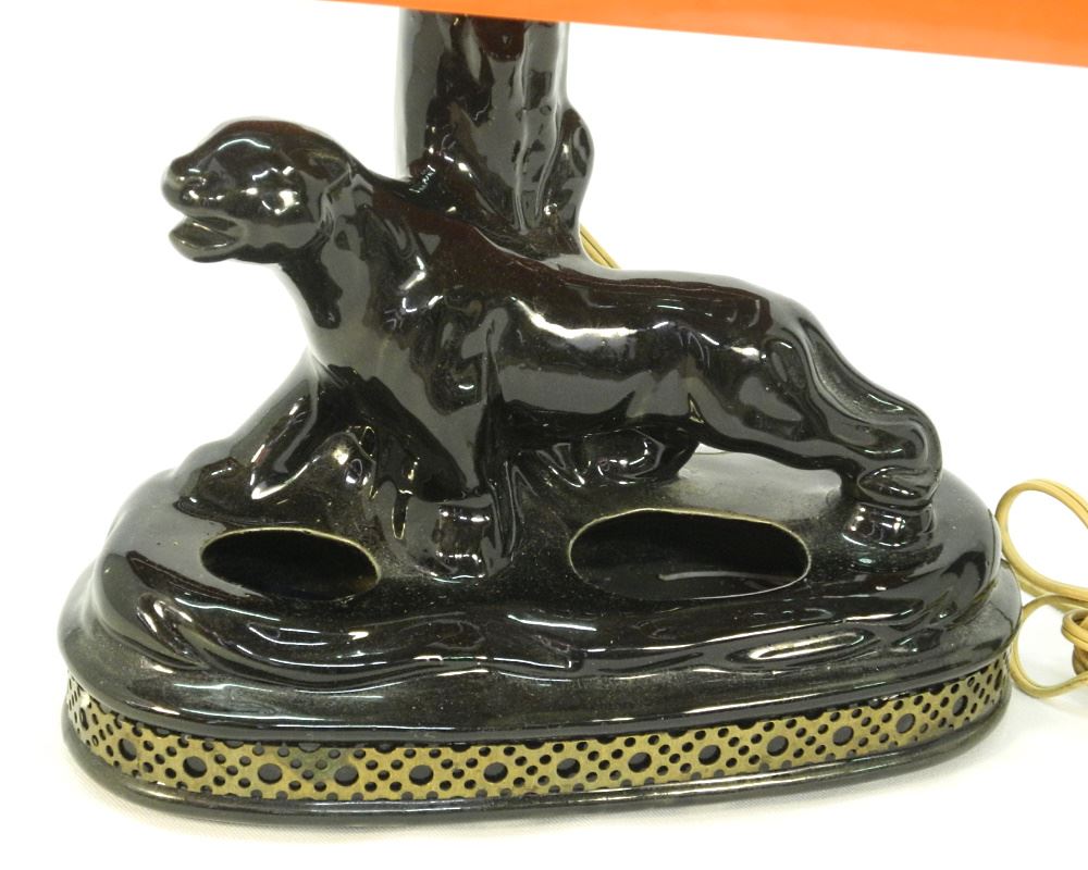 LOT 313 Vintage Ceramic Black Panther Table Lamp with Pyramidal Shade, 19 1/2 x 13 5/8 x 9 3/4". Estimate: $60 - $100 Sold For: $120 Auction Date: Tuesday, July 18 2023 at 4:00 PM