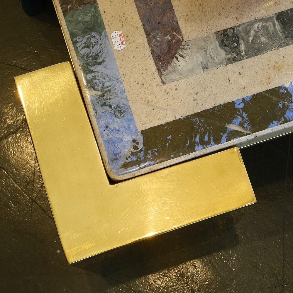 Brass Low Table with Mixed Media Concrete Surface, 14" x 48 1/2" x 48 1/2" (one corner restor