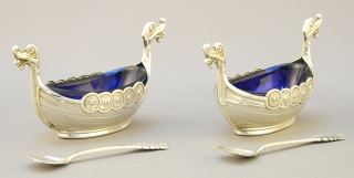 Pair of Norwegian Sterling (marked) Silver Viking Boat Condiments, 41gms