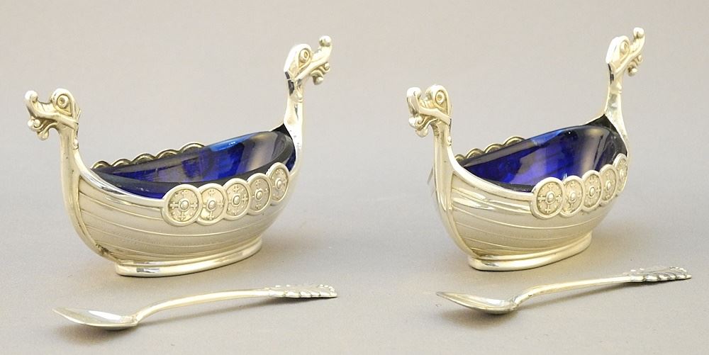 LOT 84 Pair of Norwegian Sterling (marked) Silver Viking Boat Condiments, 41gms Estimate: $80 - $120 Sold For: $80 Auction Date: Tuesday, July 18 2023 at 4:00 PM