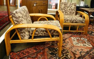 Pair of Rattan Arm Chairs with Toile Upholstery Depicting Monkeys.