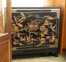 Black Lacquer Chinoiserie Double Door Cabinet, 22 7/8"H. -